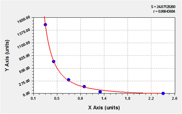 ELISA操作步驟復(fù)雜,影響反應(yīng)因素較多,特別是固相載體的包被難達(dá)到各個體之間的一致,因此在定量測定中,每批測試均須用 一系列不同濃度的參考標(biāo)準(zhǔn)品在相同的條件下制作標(biāo)準(zhǔn)曲線。測定大分子量物質(zhì)的夾心法ELISA,標(biāo)準(zhǔn)曲線的范圍一般較寬, 曲線最高點(diǎn)的吸光度可接近2.0,繪制時常用半對數(shù)值,以檢測物的濃度為橫坐標(biāo),以吸光度為縱坐標(biāo),將各濃度的值逐點(diǎn)連接, 所得曲線一般呈S形,其頭、尾部曲線趨于平坦,中央較呈直線的部分是最理想的檢測區(qū)域。測定小分子量物質(zhì)常用競爭法, 其標(biāo)準(zhǔn)曲線中吸光度與受檢物質(zhì)的濃度呈負(fù)相關(guān)。標(biāo)準(zhǔn)曲線的形狀因試劑盒所用模式的差別而略有不同。ELISA測定的標(biāo)準(zhǔn)曲線注意圖中 橫坐標(biāo)為對數(shù)關(guān)系,這更有利于測定系統(tǒng)的表達(dá)。