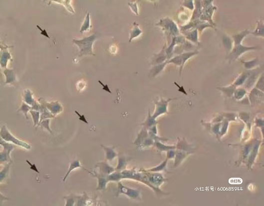 現(xiàn)象3:培養(yǎng)過(guò)程中細(xì)胞增殖突然變慢,培養(yǎng)基中黑點(diǎn)、碎片明顯增多,培養(yǎng)基PH變化(變黃)周期變短,那么細(xì)胞很可能已經(jīng)感染了支原體。